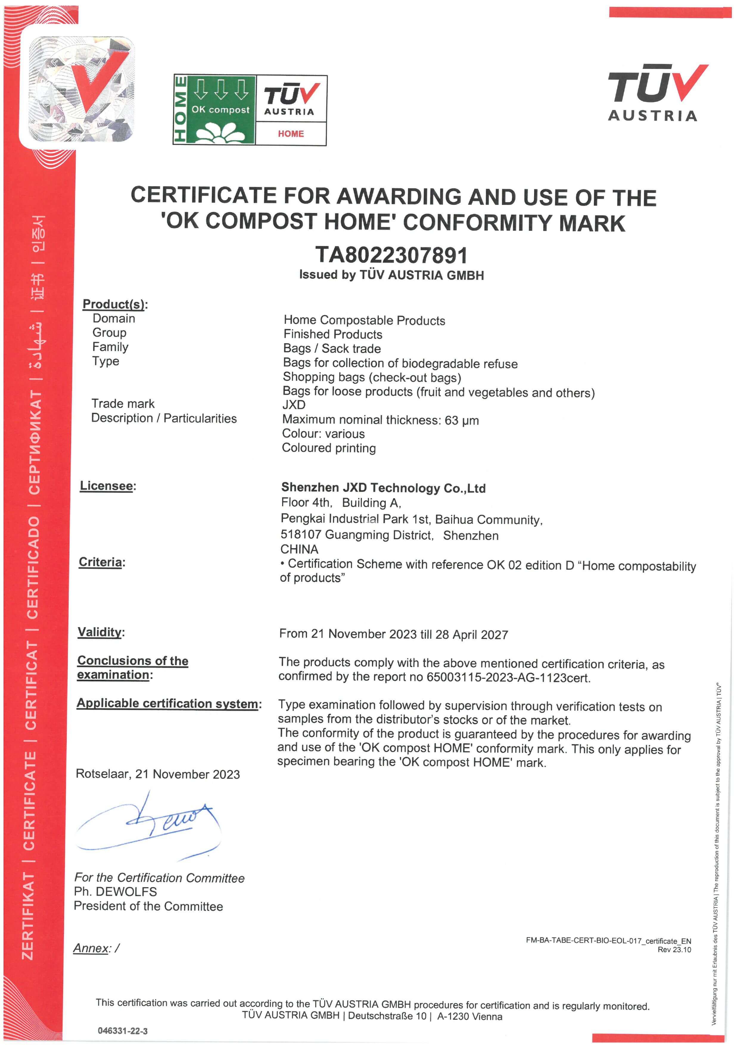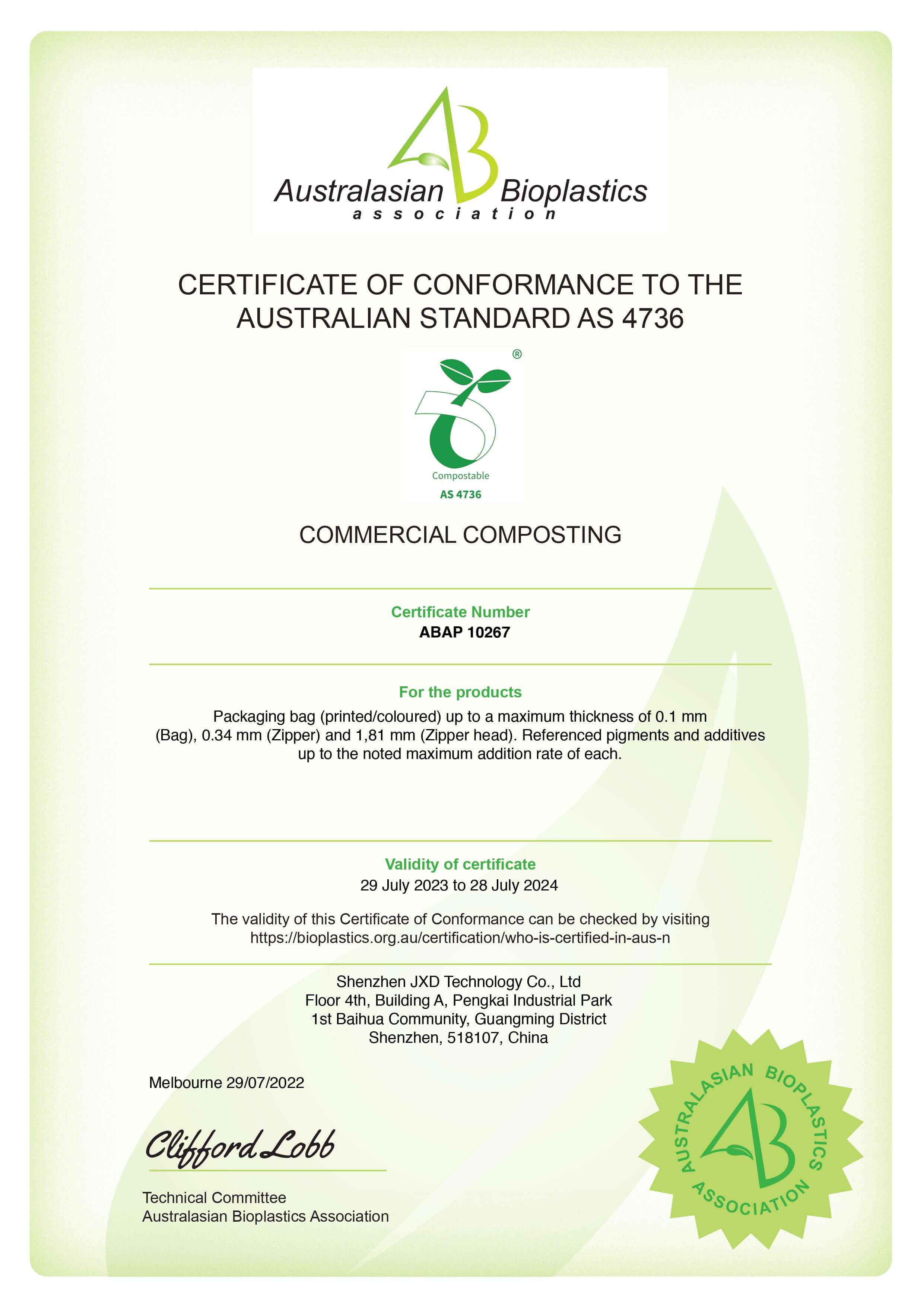獲得歐洲工業堆肥認證EN13432證書、歐洲家庭TUV堆肥認證、全球回收標準GRS認證、FSC認證、美國標準-環保認證、BSCI證書、澳大利亞AS4736認證。